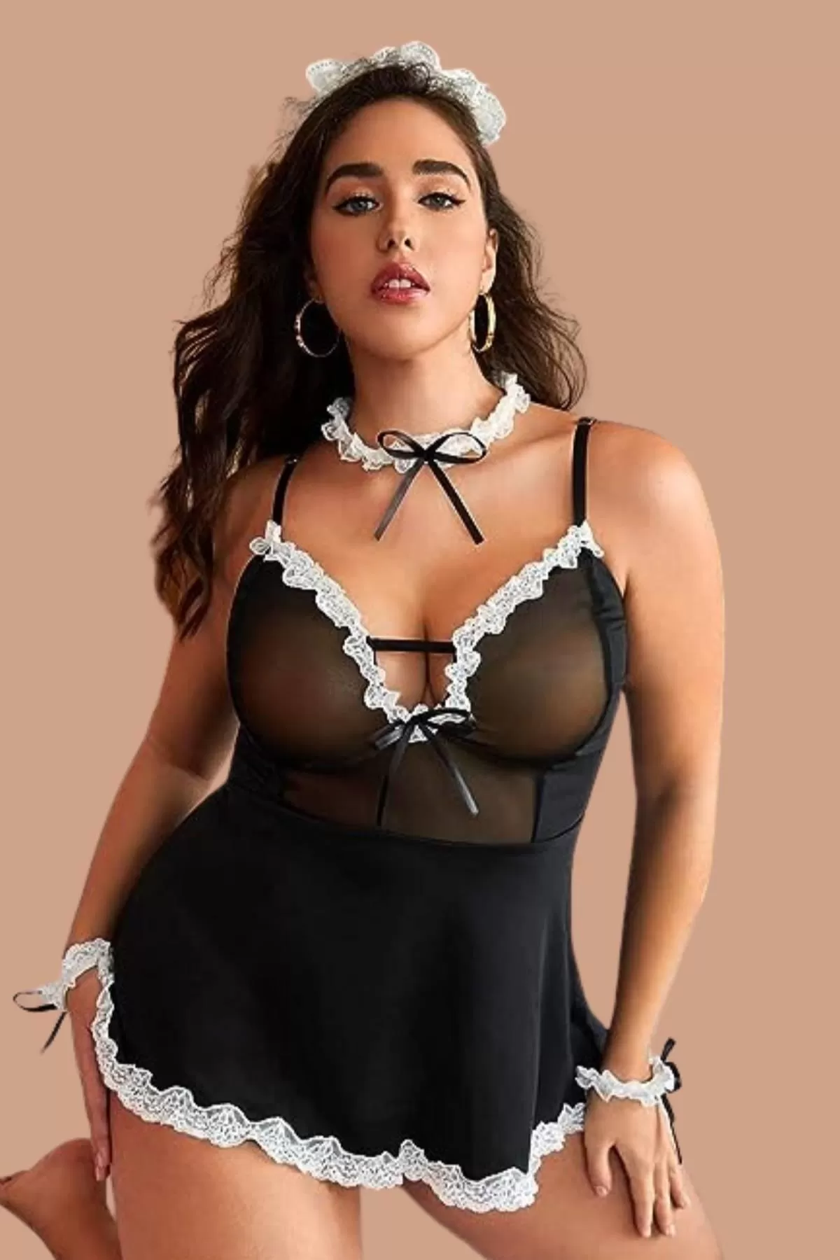 Siyah Kadın Hemşire Modeli Göğsü Tül İle İşlenmiş Şık Kostüm 50899BT,